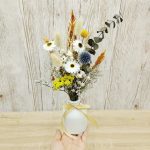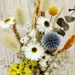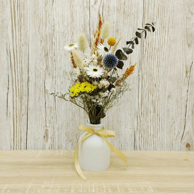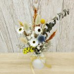 Acest aranjament floral vibrant și elegant combină o selecție rafinată de flori uscate ce au culori și texturi variate, așezate cu grijă într-o vază albă de 10 cm înălțime, oferind un efect vizual captivant și atrăgător. Aranjamentul îmbină armonios flori uscate precum Ammobium, Acroclinium, Celosia, Craspedia, Limonium, Lonas, Gypsophila, Lagurus, Echinops, Eucalipt, oferind texturi diverse și forme jucăușe. Cu o înălțime de aproximativ 25 cm și un diametru de aproximativ 14 cm, este alegerea perfectă pentru a adăuga o notă de rafinament și prospețime oricărui spațiu.