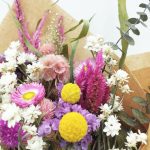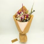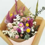 Acest buchet de flori uscate aduce un farmec aparte prin culorile și texturile sale vibrante. Ambalat în hârtie maro și roz, buchetul conține o varietate de flori, inclusiv mici flori albe (Gypsofila, Ammobium), Gomphrena și Celosia plumosa roz, biluțe galbene (Craspedia) și alte flori asortate. Aranjamentul este vizual atrăgător datorită combinației de culori vii și diverse texturi, fiind ideal pentru a adăuga o notă de naturalețe și rafinament în orice decor.