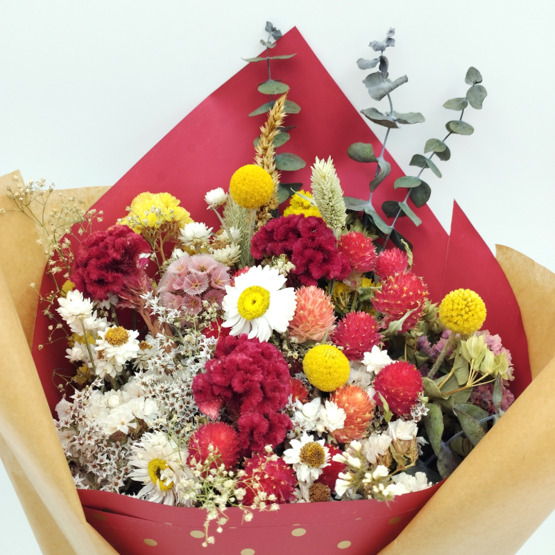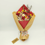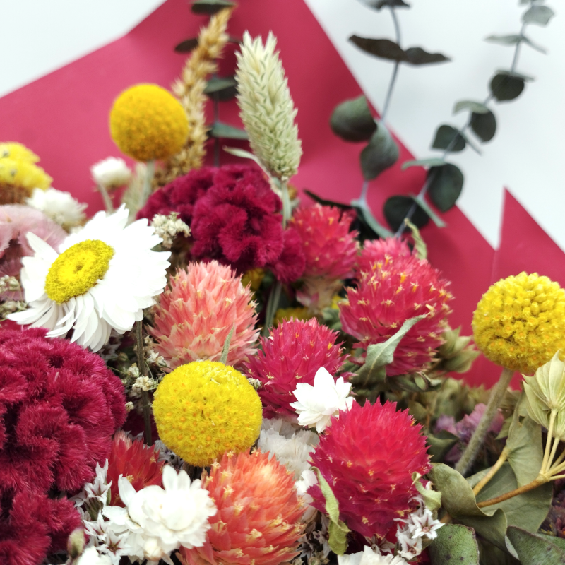 Acest buchet de flori uscate impresionează prin farmecul său rustic și diversitatea de culori și texturi. Ambalat într-o hârtie maro cu accente roșii, buchetul include margarete albe cu mijloc galben, biluțe galbene și roșii, flori de creasta cocoșului roșii și alte flori mici albe și roz. Frunzele verzi de eucalipt completează aranjamentul, adăugând un plus de prospețime. Combinația de culori și texturi creează un efect vizual atrăgător și interesant.