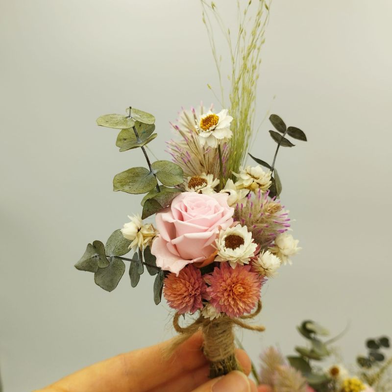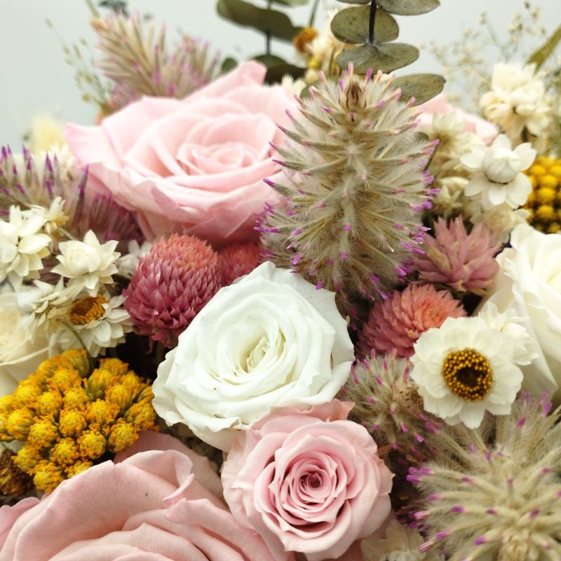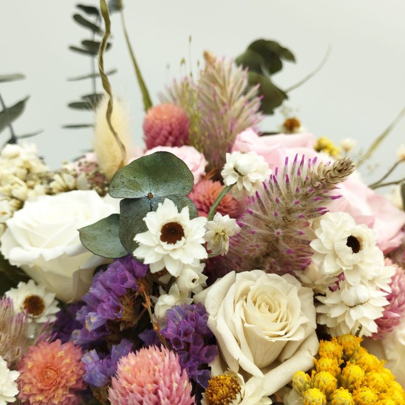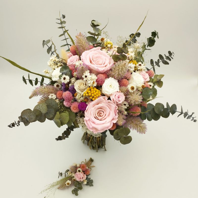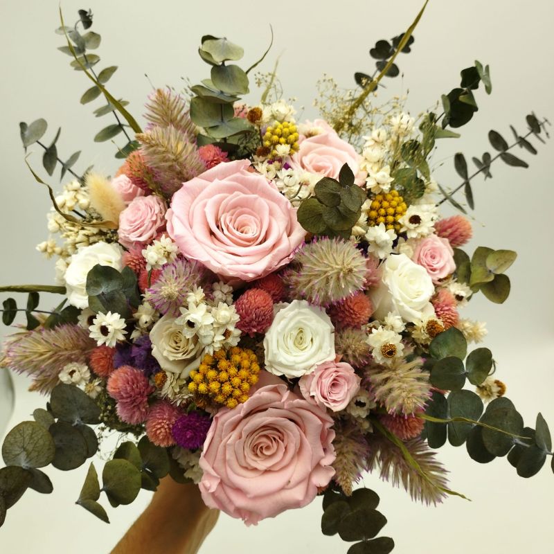 Acest buchet de mireasă rafinat îmbină armonios flori uscate și stabilizate, creând un aranjament deosebit, ideal pentru o nuntă cu tematică naturală, rustică sau elegantă. Cu un contrast spectaculos între nuanțele delicate de roz, alb și galben, buchetul include flori atent selecționate precum  Ptilotus, Lonas, Gomphrena, Ammobium, Limonium, Eucalipt alături de trandafiri criogenați de un roz fermecător.