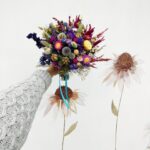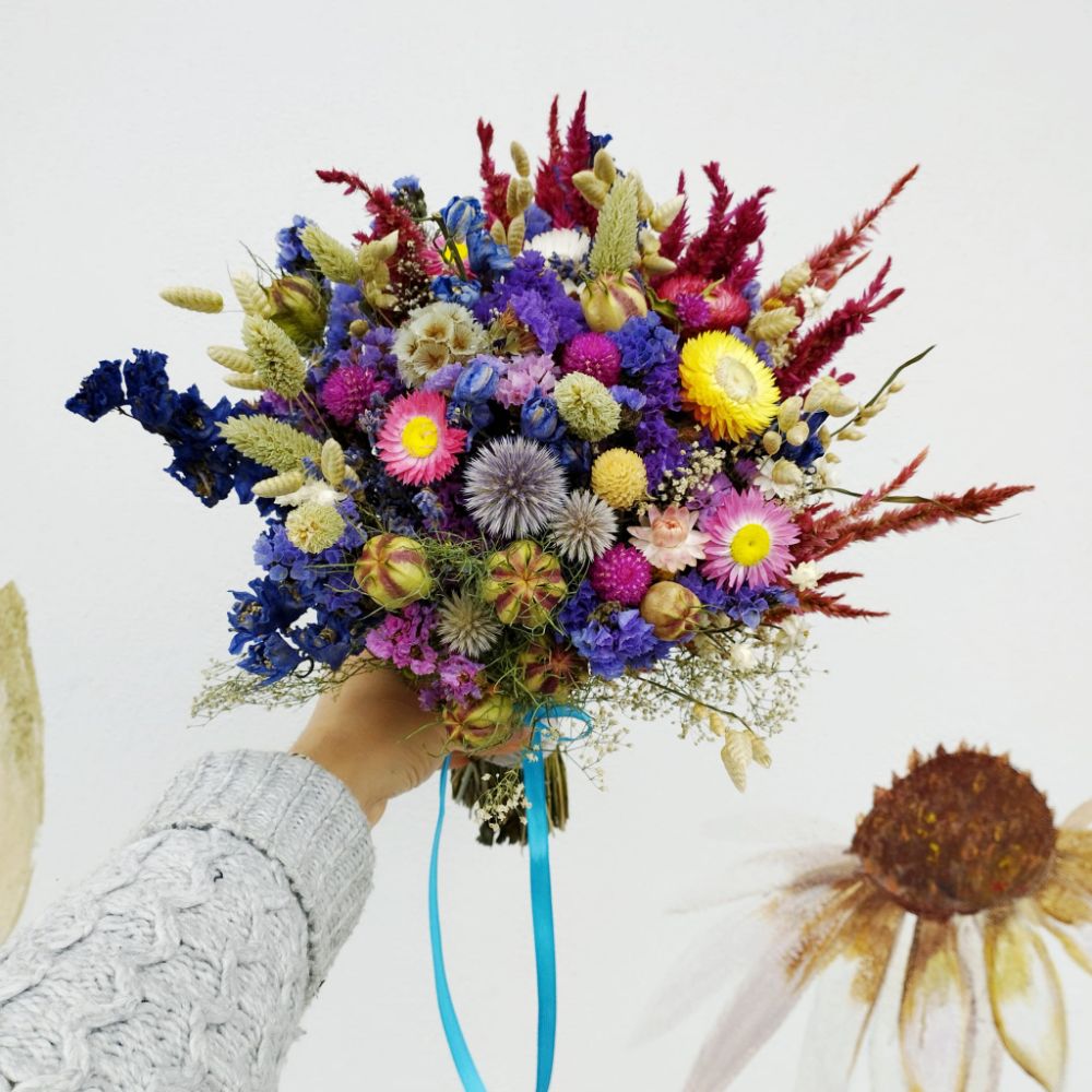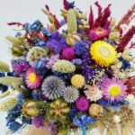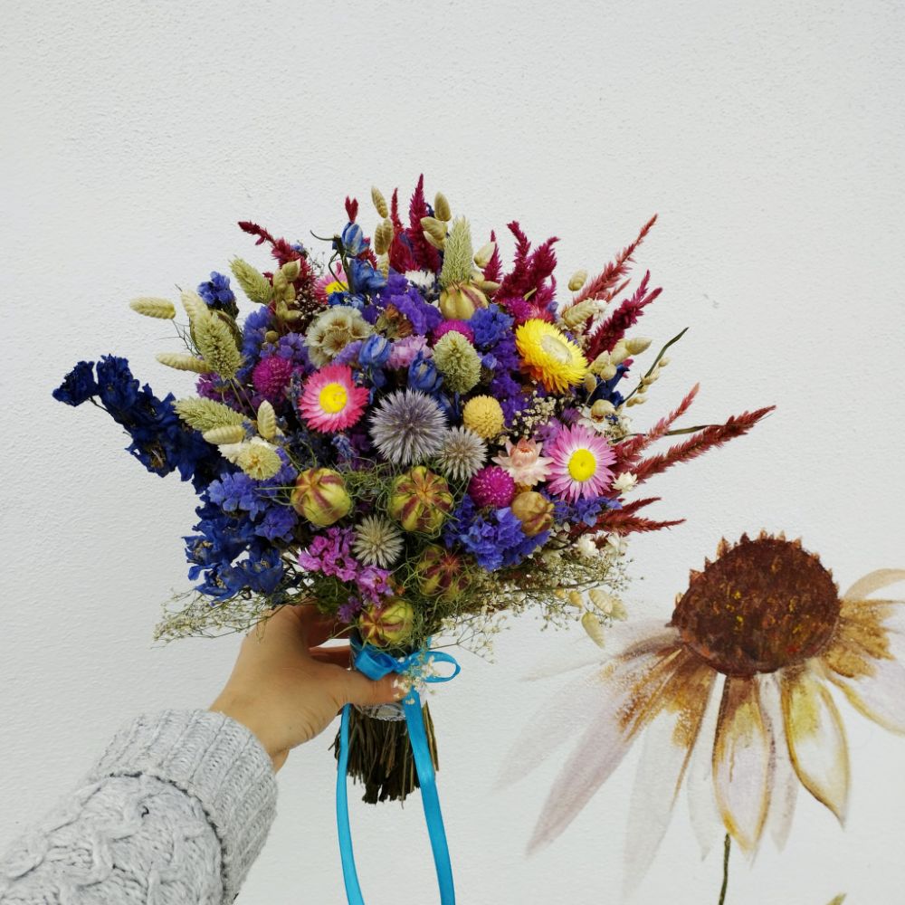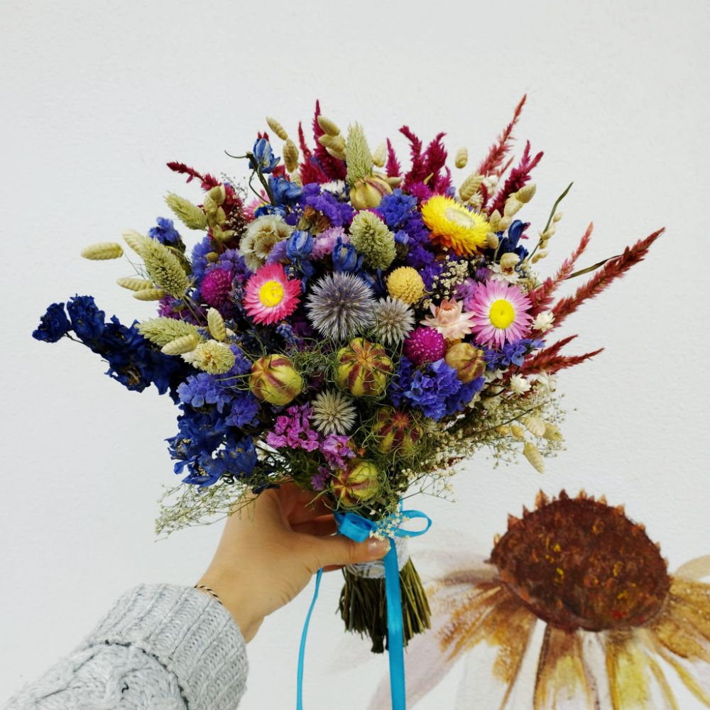 Un buchet plin de energie și culoare, în care florile uscate se împletesc într-o explozie veselă de nuanțe: albastru regal, roz aprins, galben solar și accente crem, ivoire și bordo. Printre florile atent alese se remarcă capetele texturate de Helichrysum, capsulele delicate de Nigella, spicele aurii de Phalaris și  Delphinium-ul intens, care adaugă volum și profunzime.