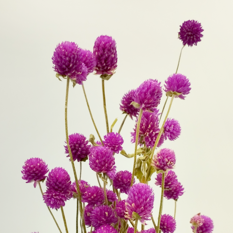 Gomphrena mov este o floare uscată delicată, cu un colorit intens și elegant, care adaugă un accent rafinat și plin de farmec în aranjamentele florale. Cu forma sa rotundă și textura aparte, această floare este ideală pentru buchete, coroane sau decoruri handmade. Durabilă și versatilă, aceasta oferă un aer sofisticat și vibrant, fiind perfectă pentru compoziții florale cu un stil romantic, boem sau modern.