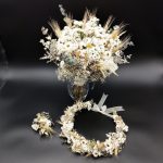 Un set de mireasă elegant și simbolic, inspirat din puritatea florilor albe și din bogăția câmpurilor coapte. „Ivory Harvest” este un omagiu adus începuturilor curate și promisiunilor rostite cu sinceritate, reunind într-o armonie naturală flori uscate și grâne atent selecționate.